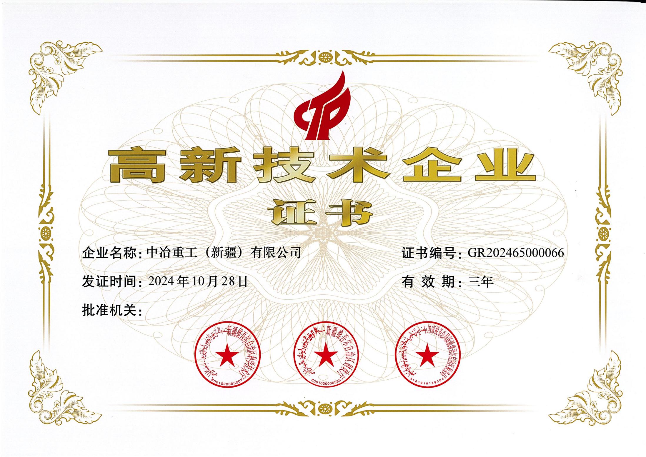 中冶重工(新疆)有限公司再獲“高新技術(shù)企業(yè)”國(guó)家級(jí)品牌資質(zhì)