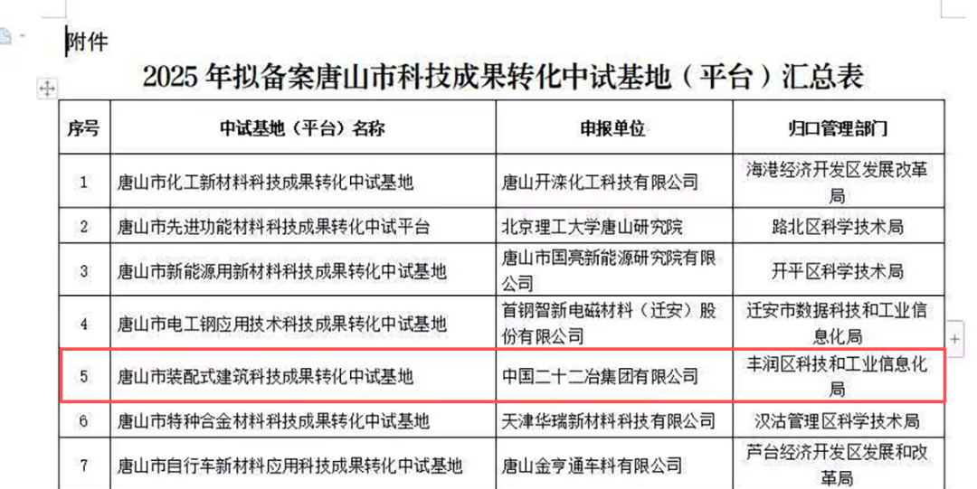 近日,經(jīng)唐山市科學(xué)技術(shù)局審核與公示,由裝配式公司牽頭申報的“唐山市裝配式建筑科技成果轉(zhuǎn)化中試基地”成功入選2025年度唐山市科技成果轉(zhuǎn)化中試基地示范(平臺),標(biāo)志著公司在裝配式建筑領(lǐng)域的科研實力與成果轉(zhuǎn)化能力獲得市級認可與支持。