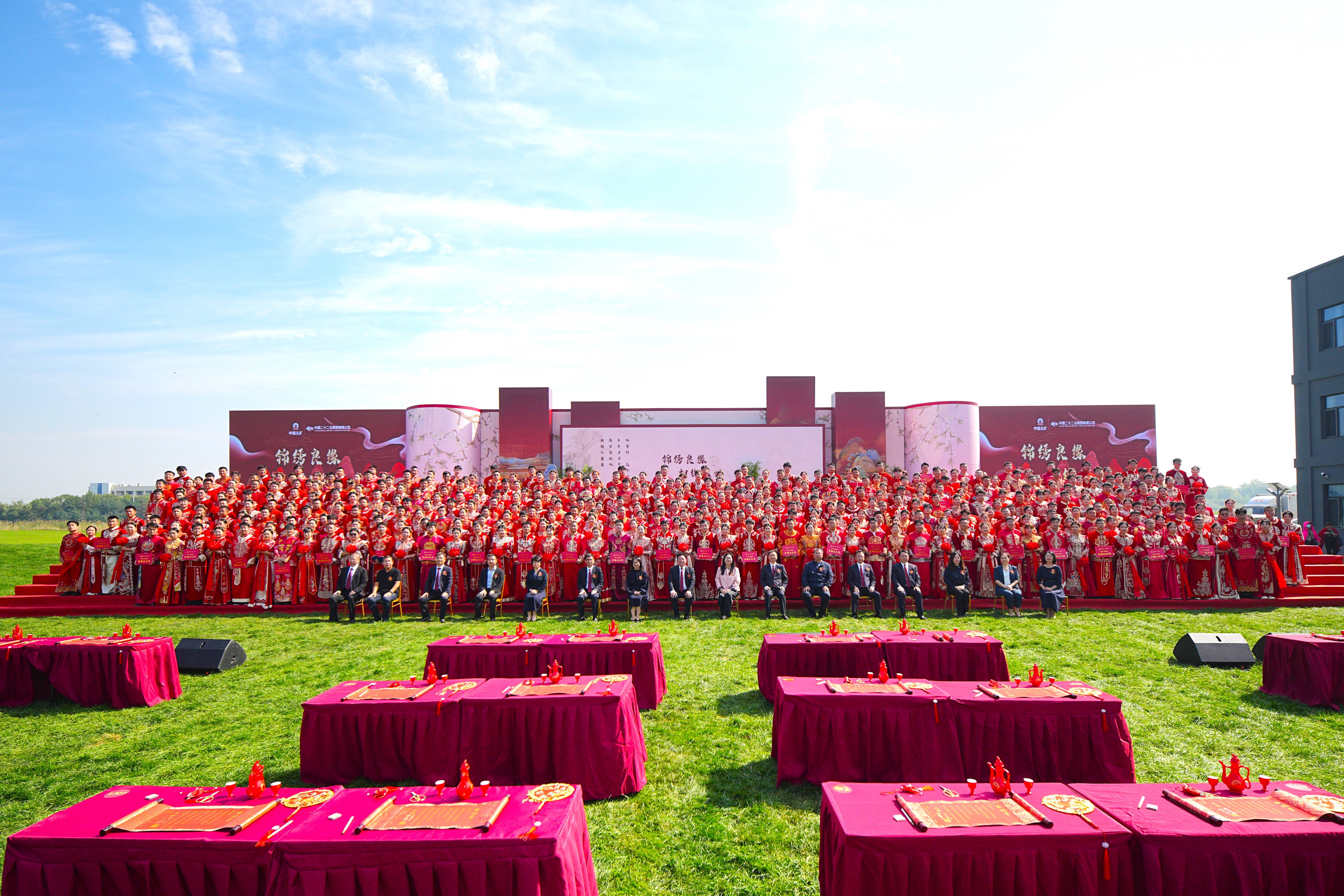 吉時(shí)已到,華燈初上。至親摯友歡聚一堂,共賀新禧,同證鴛盟。203對(duì)新人執(zhí)紅綢相牽,踏錦毯徐行。新娘鳳冠流彩,團(tuán)扇半掩芙蓉面;新郎紅袍玉帶,眉宇盡展英氣。八方賓客共睹此天作之合,百對(duì)新人同締山海之盟,滿座皆沐華夏婚儀之雅韻,共仰千年禮樂之風(fēng)華。